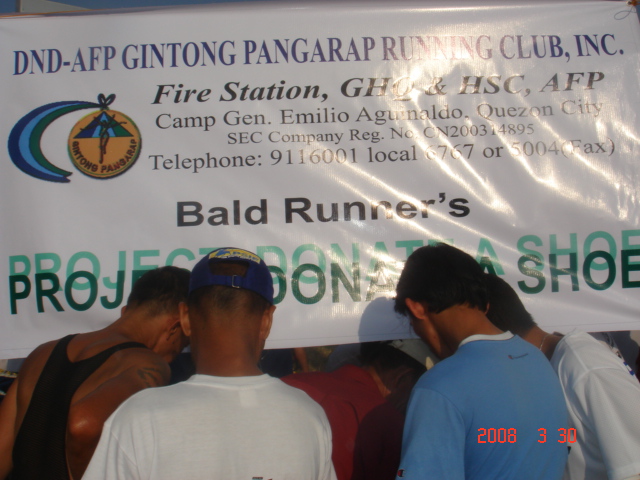This concept or project of donating my old running but still reliable running shoes and encouraging others runners to donate their old shoes was born out from my observations of seeing young and senior runners participating in weekend road races, most especially in the 2008 Pasig River International Marathon last February 2008, who were seen with tattered and worn-out running shoes, walking and limping on the side of the road. So, I decided to post the pictures of my old running shoes to let the other runners know if they are in need of my old shoes or share the information to other runners and maybe, ultimately, make my offer reach to the needy ones. The comments of The Bull Runner, Banana Running, Quick Silver Runner, Mark, Cecil/Miraclecello, Benov, Datc, and others from that post inspired me to push through with this project through the help of my Officers & Staff of the DND-AFP Gintong Pangarap Running Club, Inc. And I am glad that this project was later endorsed by these bloggers in their respective posts.