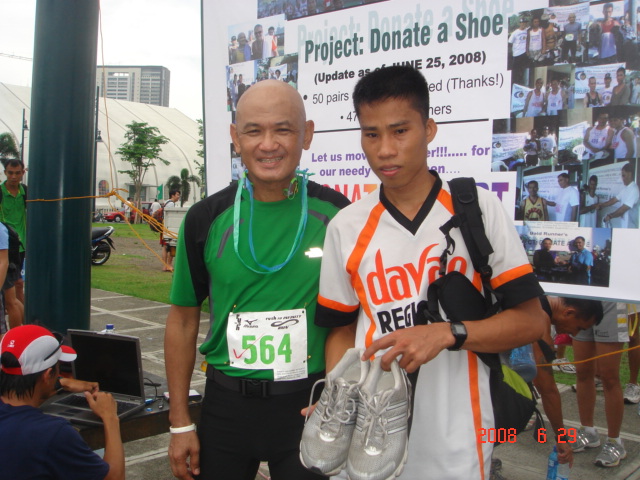The Project Donate A Shoe is now under the auspices of the “Bald Runner’s Events” which is now a duly registered entity which has a license to operate from the Department of Trade and Industry (DTI). Capt Ferdie Espejo came up with a new tarpaulin background of our booth, which you see in the background on all the pictures taken. Captain Espejo will be my frontman and associate in this understaking.