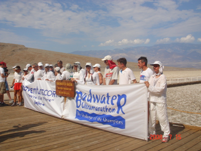 The Badwater Ultramarathon Starting Area is a small Rest Area or Viewing Area of the Badwater Basin along the CA Highway 190 which has a parking area good for about 50 cars, toilets, and a wooden elevated stage where the elite runners had their group picture before the start of the race.