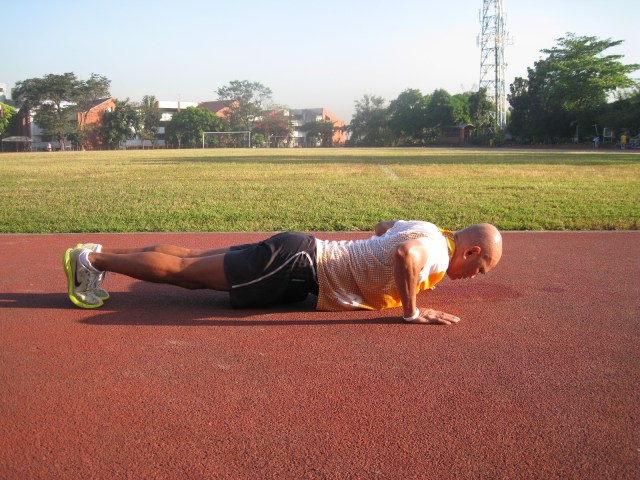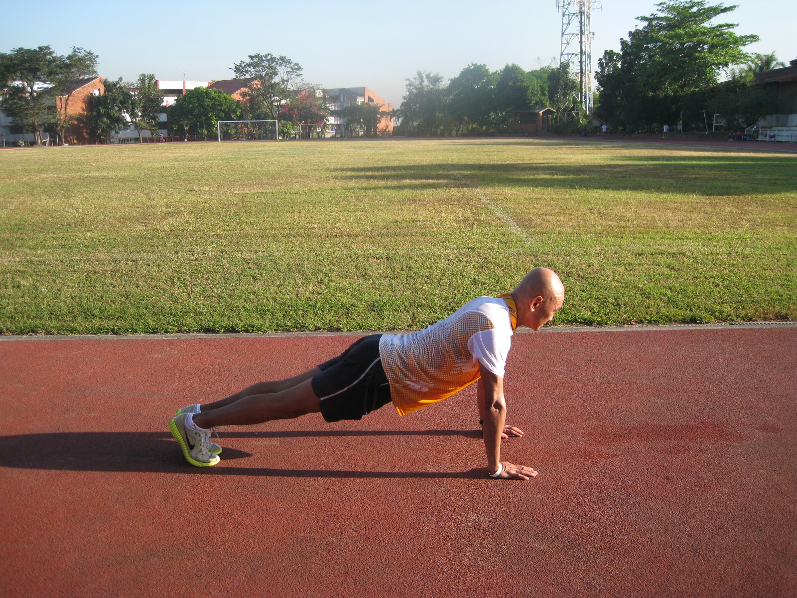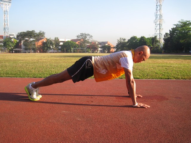 I always try to do 20 repetitions of push-up properly after my workouts. Be sure that your upper arms are aligned with your back when you are on “down” position. Your palms’/hands’ distance should be your shoulders’ width.