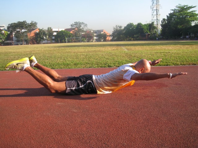 Lift your legs and upper torso with arms straigthen forward and hold this position for 10 seconds. Repeat 4X. Maintain regular breathing.