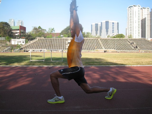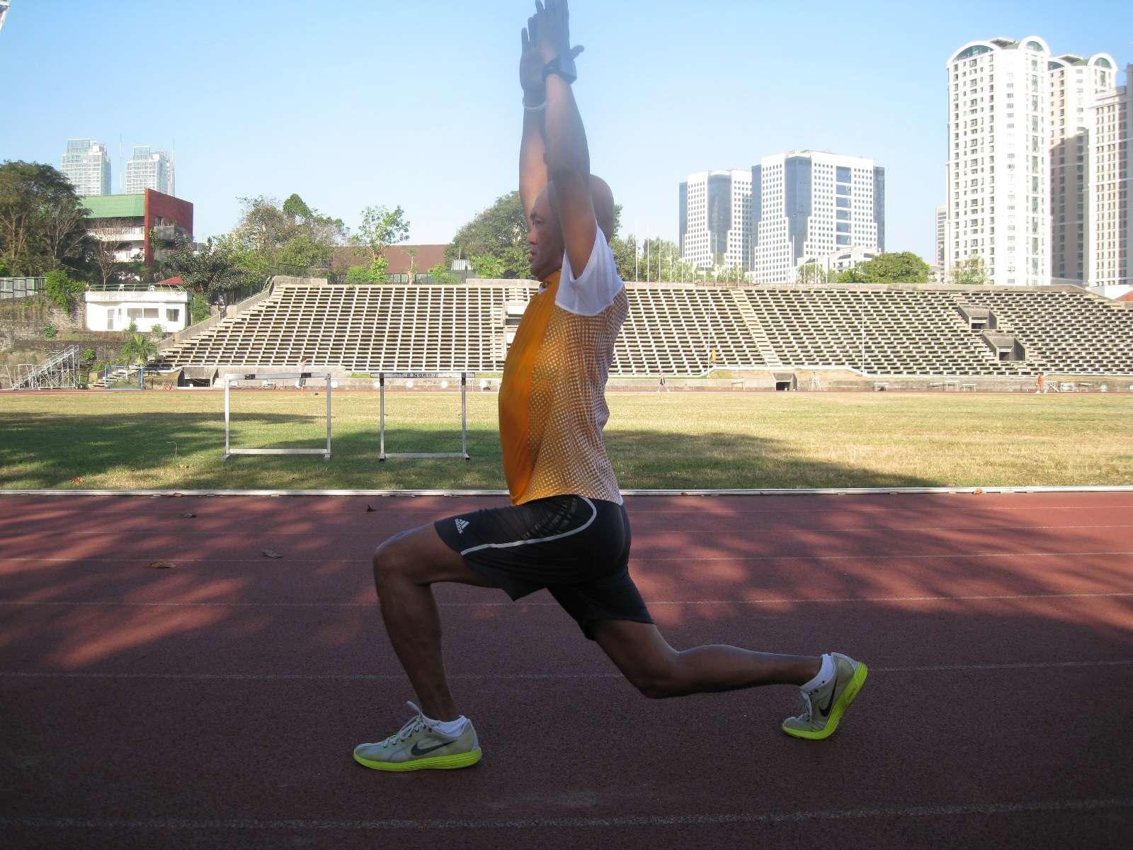 Lunge one foot forward as far as you can and bring the body down while bringing both arms up in the air. Do 10 lunges per foot/leg.