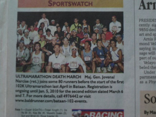 In last Sunday’s edition of the Philippine Daily Inquirer (Dec 20, 2009), the runner-participants in the 1st Bataan Death March 102K Ultramarathon Race who posed in a picture taken before the race were featured in a picture posted at the “Sportswatch” section of the said newspaper.