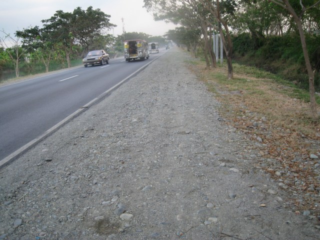 5. From Apalit to San Fernando, I ran along the left sidewalk as I was facing the traffic. Instead of running along the paved road, I was running on a dirt road filled with stones and lahar. All the way, the rugged road gave comfort to my feet as I had soft landing with the ground. However, on the other side, the sidewalk is paved. But from San Fernando to Mabalacat, both sidewalks are not yet paved. I am glad the acacia trees along the highway were not cut as planned by the DENR and Department of Public Highways. I could see that there is an ample space for expansion of the road but cutting those acacia trees will not justify the intended infrastructural development.