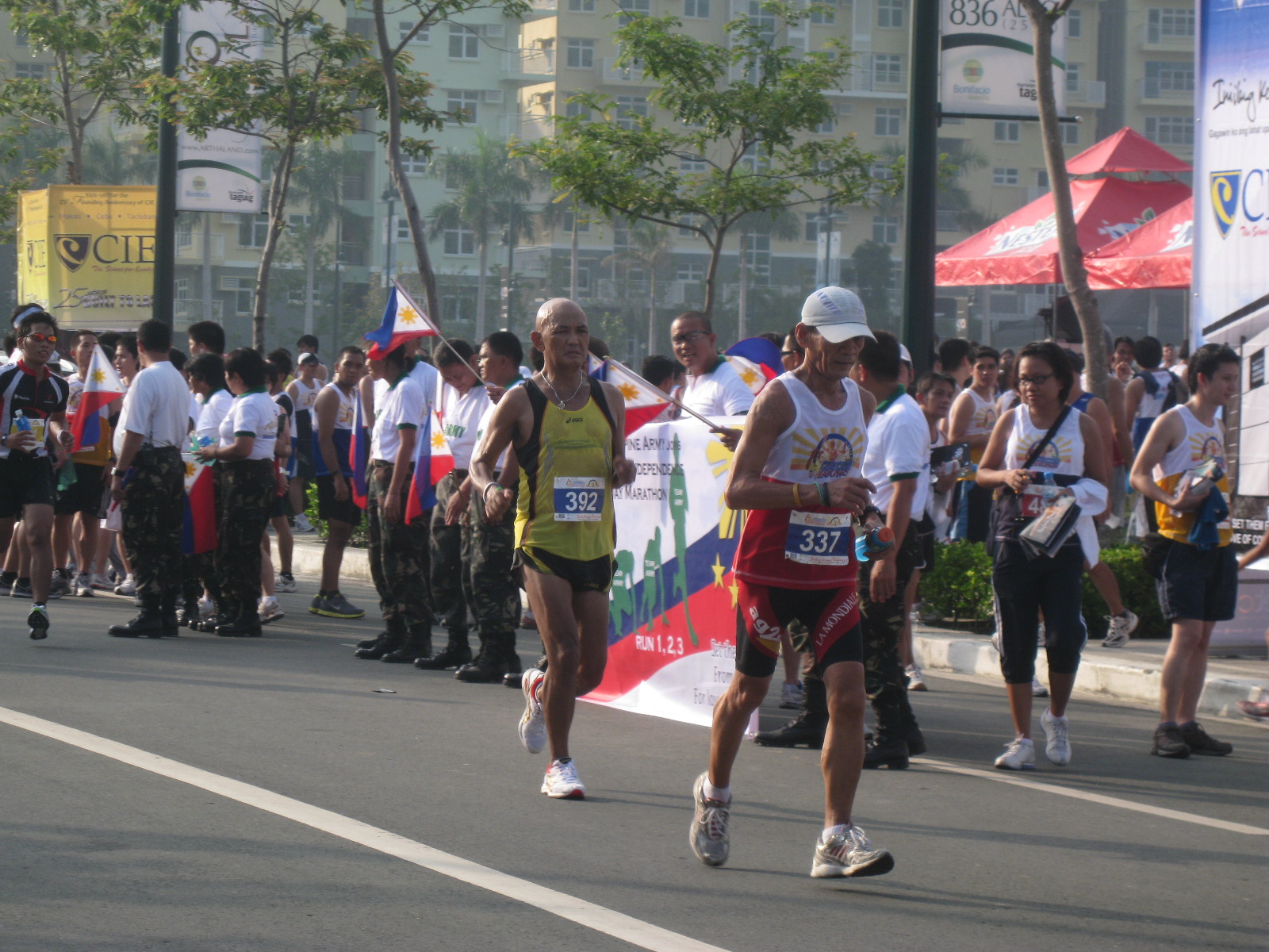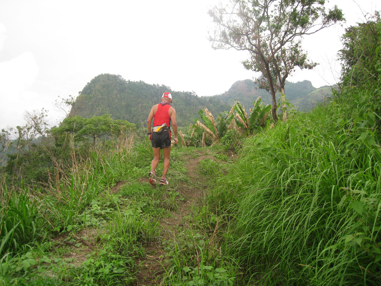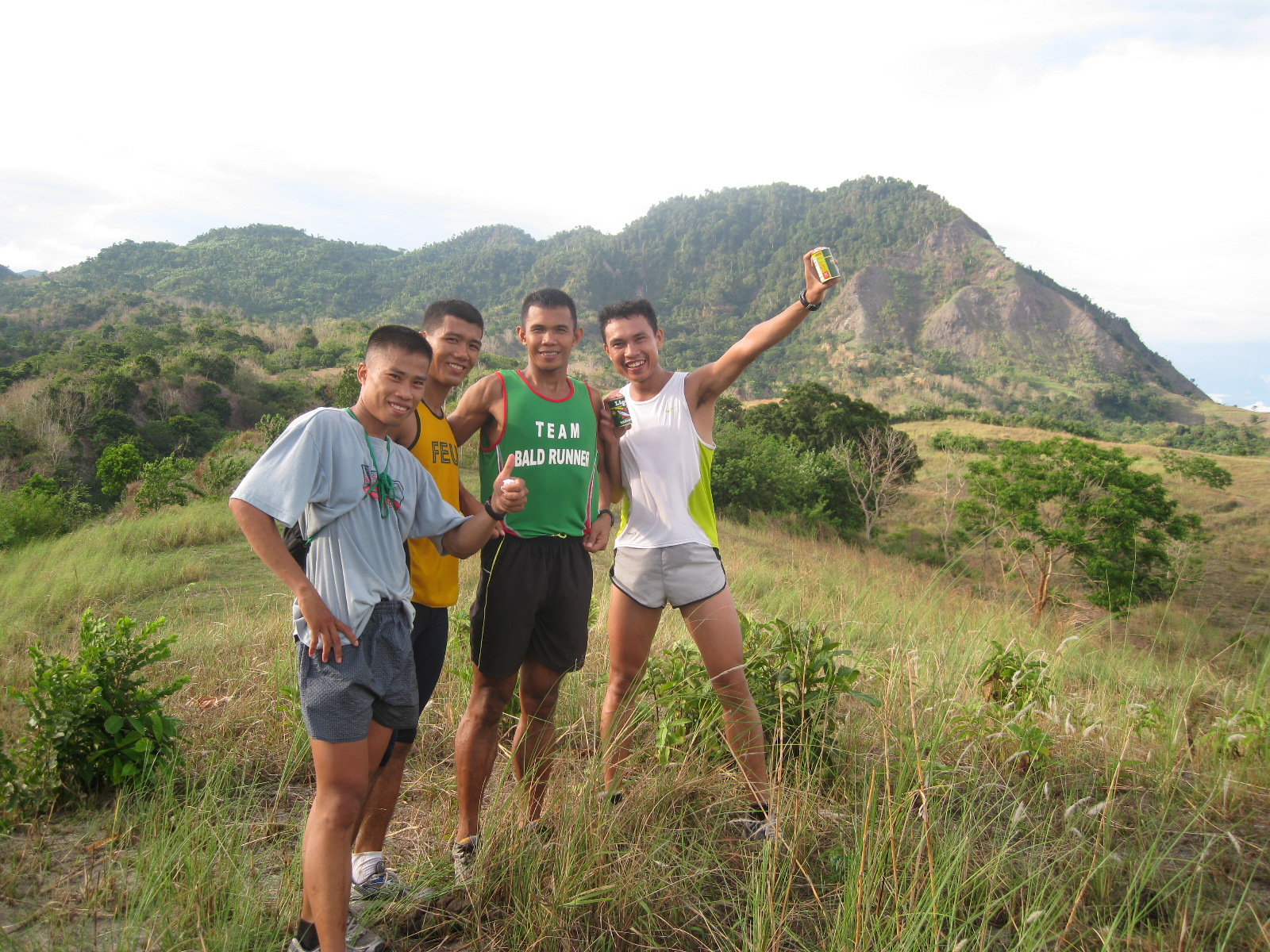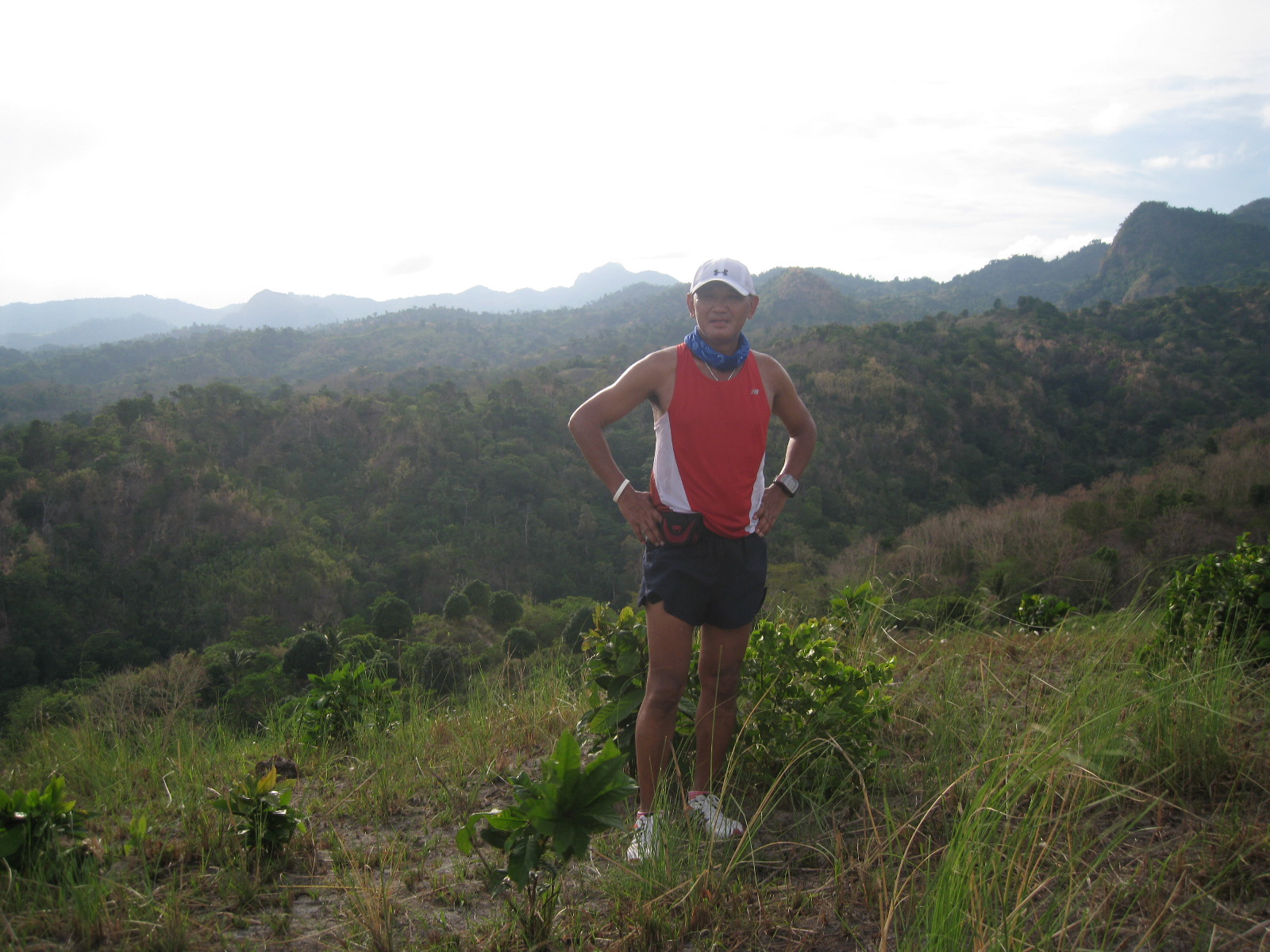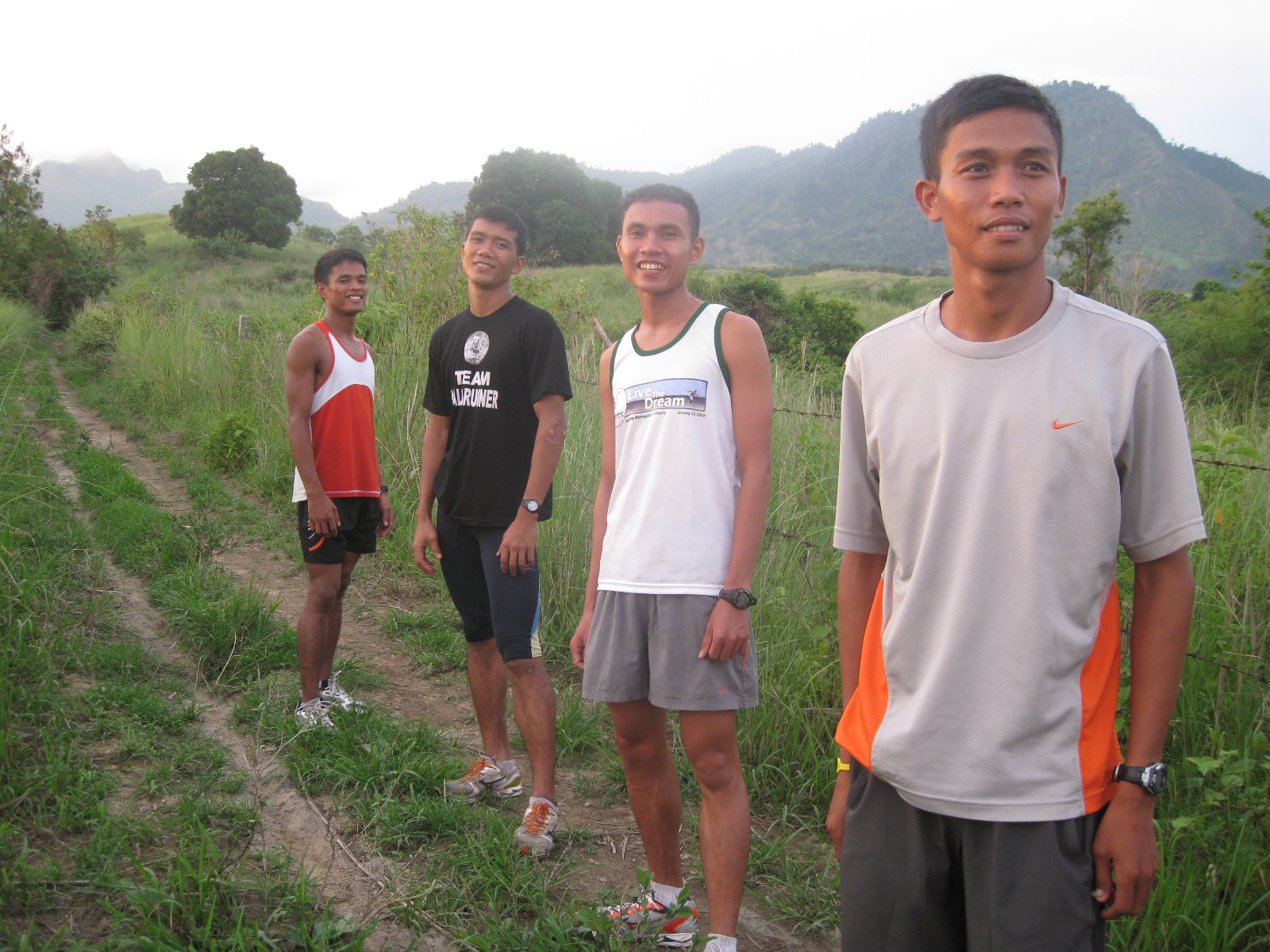 With 5 kilometers to go, Elmer and Frank met us on top of a hill with bread and water. Elmer finished his run earlier and used his motorcycle to go back and meet us along the trail. It was a relief for Charlie and Jack to eat and drink as they were tired already. I was tired, too! but I still have water from the spring in my Nathan hydration belt. Jack has to ride the motorcycle because of his torn shoes and Frank joined us for the remaining parts of the run.