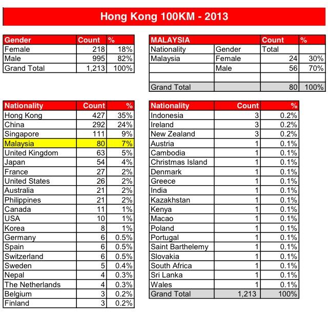 The Pinoy Runners were ably represented in the 2013 Vibram Hongkong 100K Ultra Trail Run with 21 registered runners, to include 4 lady runners, out of the 1,225 participants in the event. Out of the 21 registered runners, 18 runners had been listed as finishers in the posted provisional result of the race. It is worthy to note that only 854 runners finished the race out of the 1,225 starters. Hereunder is the list of Pinoy finishers with their respective ranking and finish time: