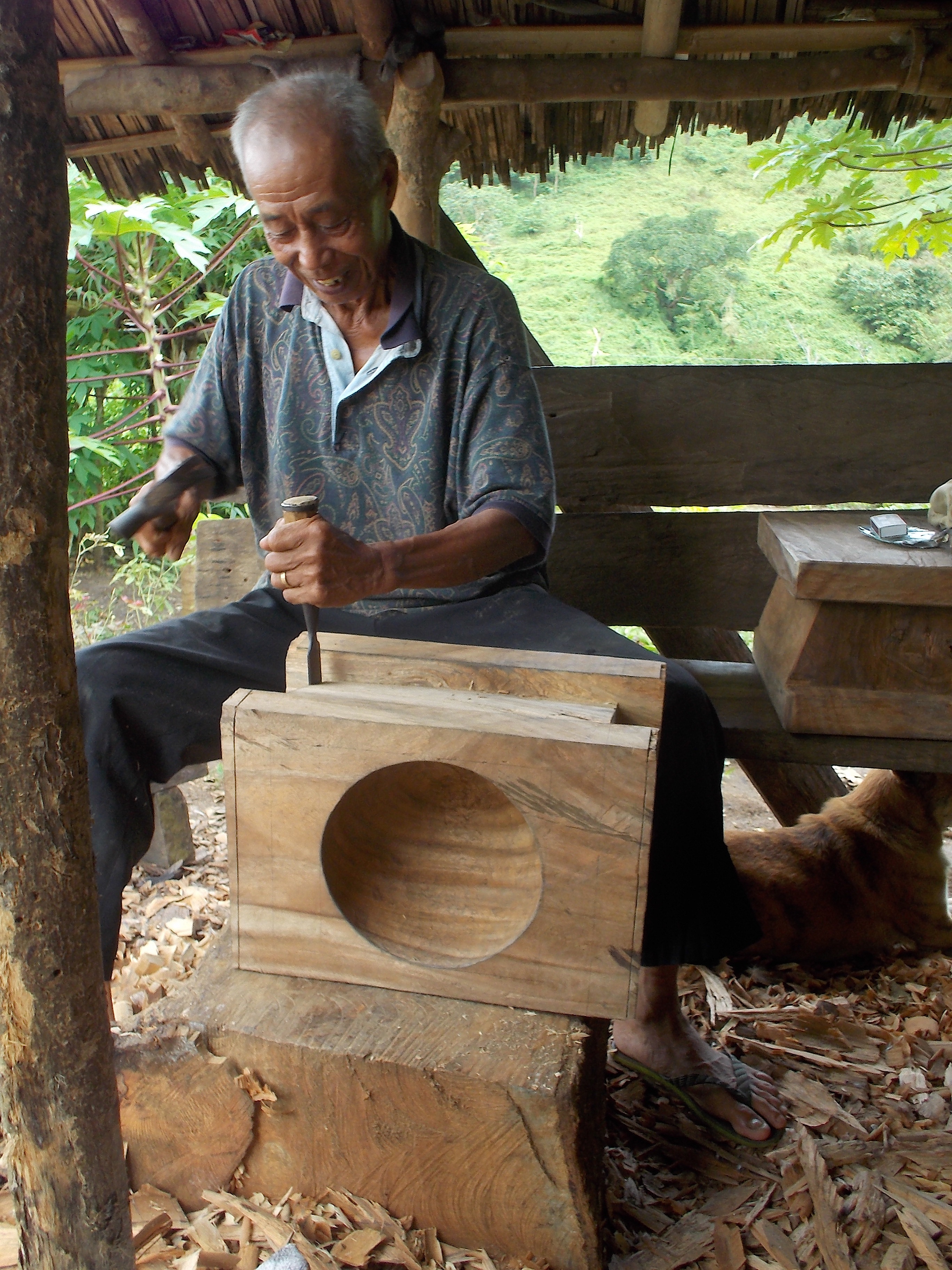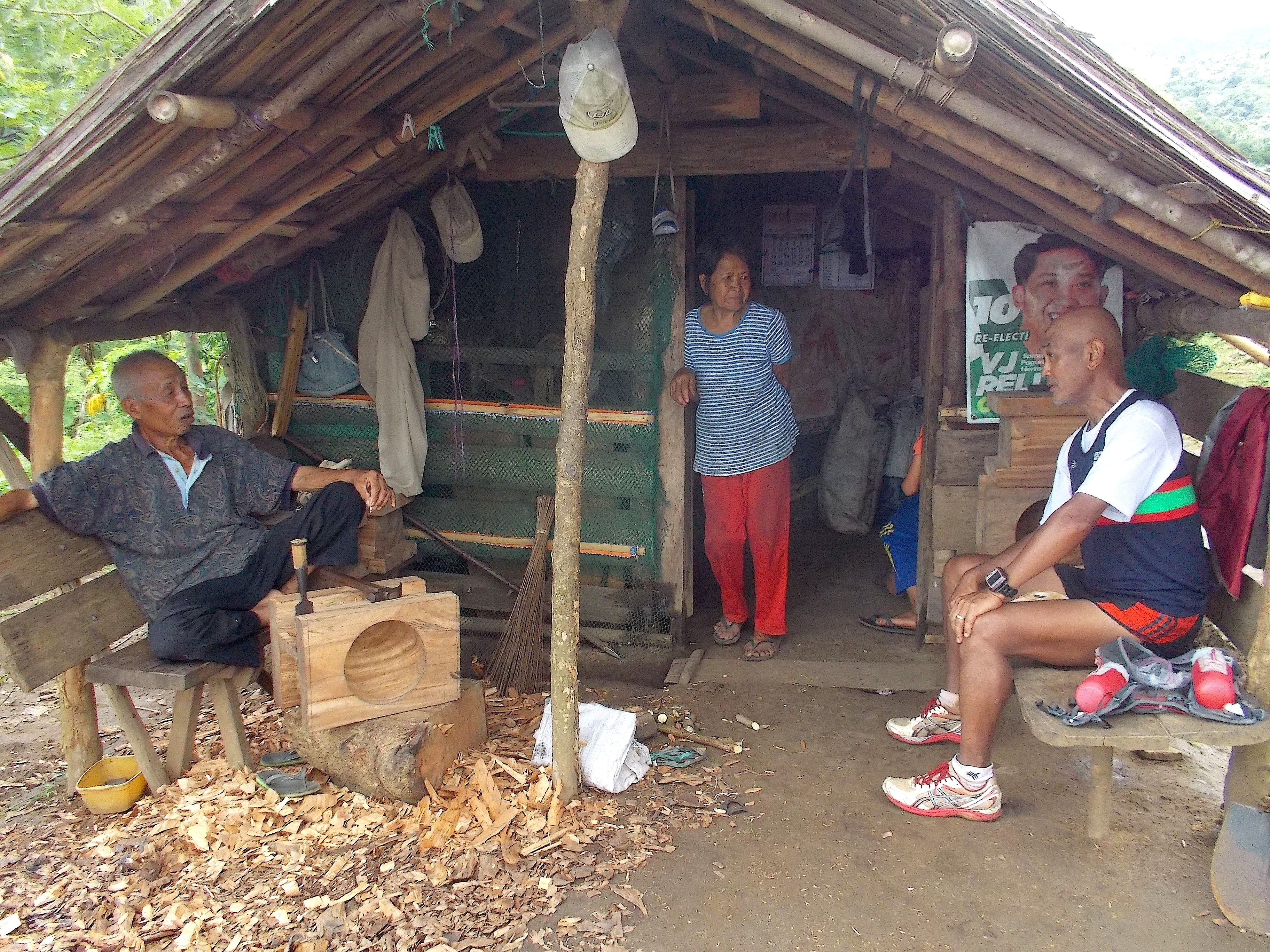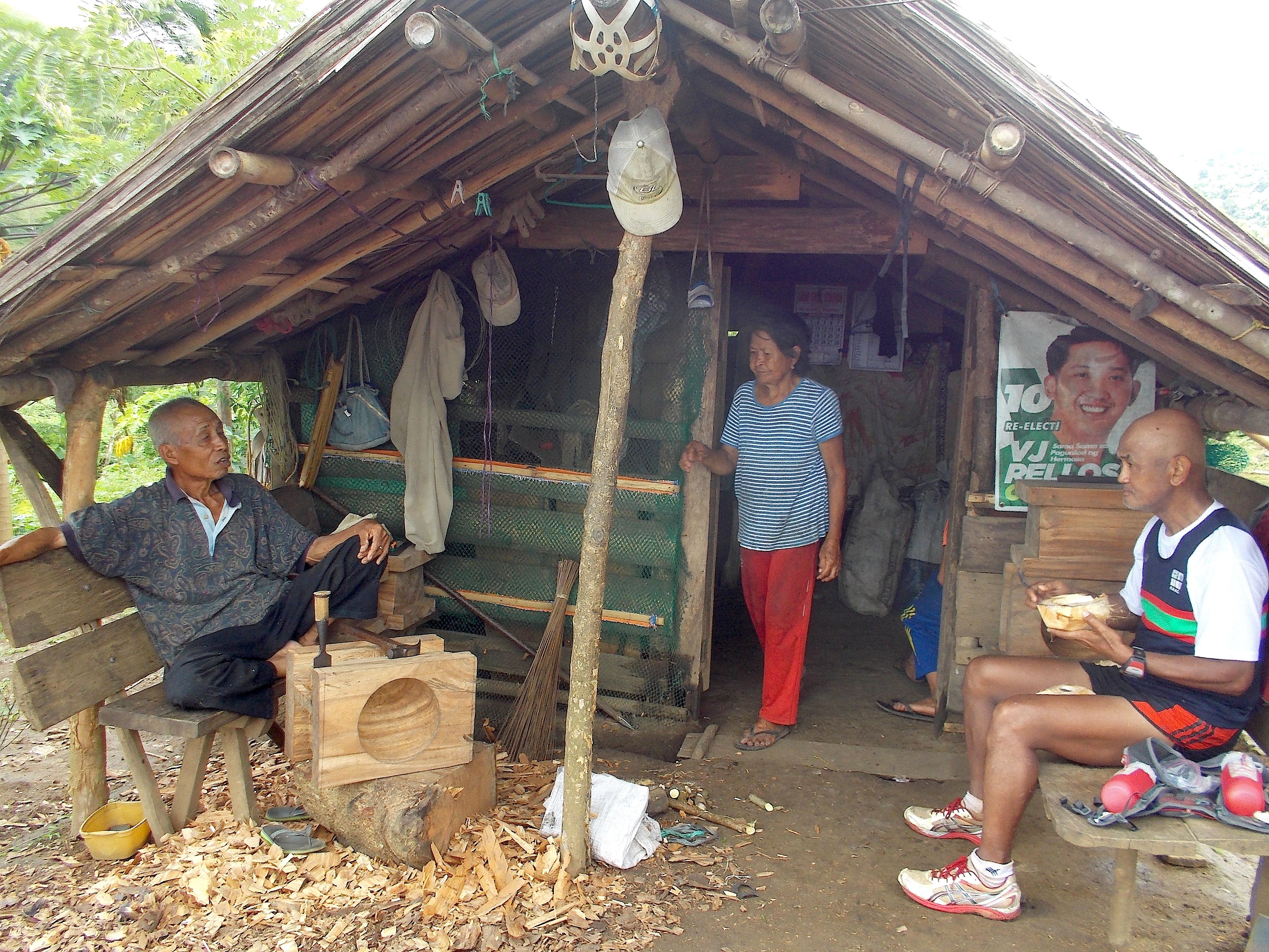 Nowadays, his exercise is his hobby, making wooden mortars & pestle for his relatives. The mortars are made from acacia wood and they are heavy. I asked him to make one piece for me and he said affirmatively, subject to the availability of acacia wood. He was generous to share us his fresh coconuts and declined my offer to pay for them. He even went to the extent of asking the contact number of one of my boys so that he can immediately inform me if there is a wild boar’s meat from his hunting trips in the area!