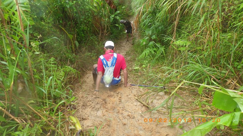 At the back of my mind, I would like to register a “negative split” of my time in this race by being slower on the first half and then going faster on the last half of the race. Obviously, that will happen because the first half is an uphill climb to Mt Miyamit/turn-around point which has an elevation of about 1,150 meters above sea level and then the last half will all be generally downhill. But such conditioning to the mind did not happen because of the weather condition that brought about with those slippery, muddy, and water-soaked trails.