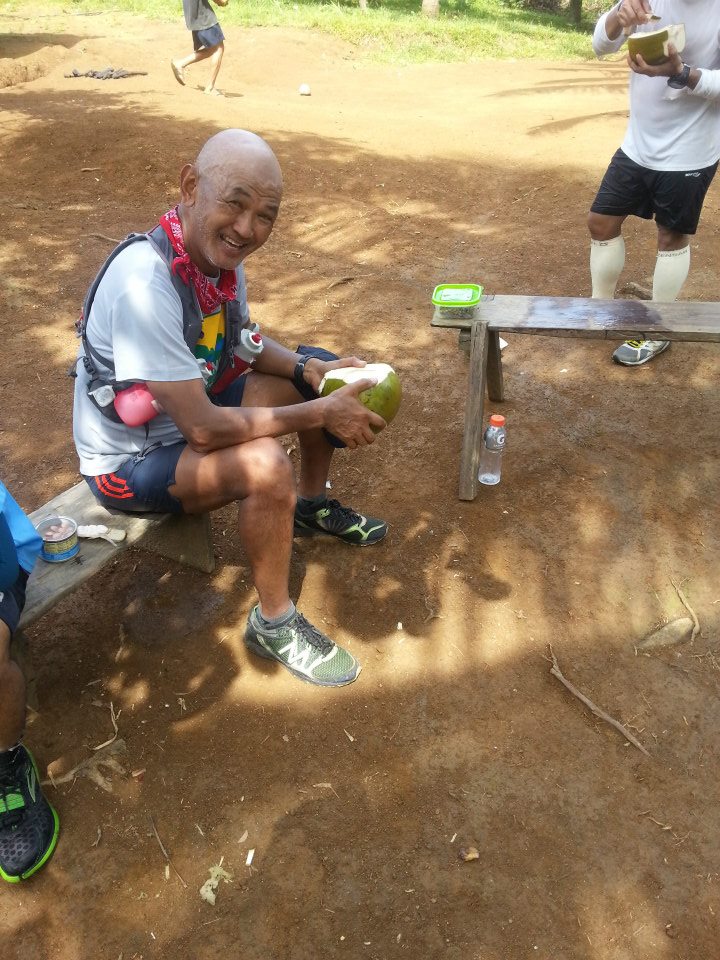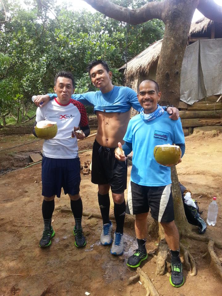 After the uphills, downhills and some flat areas, we would cross two big streams until we reach the farm of one of the locals, Mang Mario. This is where we refill our bottles with water; have a taste of fresh coconut juice direct from the tree; hydrate & eat some snack food we carried and another chance to take pictures. I usually talk to Mang Mario and his wife and later give him some packs of “Pentagon” Cigarettes, his favorite brand, and some cash to pay for our coconut fruits before we leave his farm. Well, for the past 2 months that I’ve been dropping by in his farm in my runs, Mang Mario and I became friends and he knows what runners would need when we stop in his place. He would offer his benches for us to sit and order his son to pick some coconuts immediately. This is a result of my “sardines approach” in winning some of my friends in the mountains.