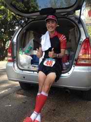 Together with Jilbert who diligently took notes on my hydration and nutrition throughout the run, I had judiciously monitored my hydration, making sure that I had generous sips of water, buko, and energy drink every 1.5 to 2 kilometers – so I couldn’t be dehydrated. I wasn’t at all dizzy or disoriented, even under the extreme heat that accompanied me most of the way. Instead of mulling over a change in strategy and telling anyone (including my support, who was in constant contact with the missus via text messaging) about my java-tinted discharge, I remained focused on getting through to the finish despite this minor distraction.