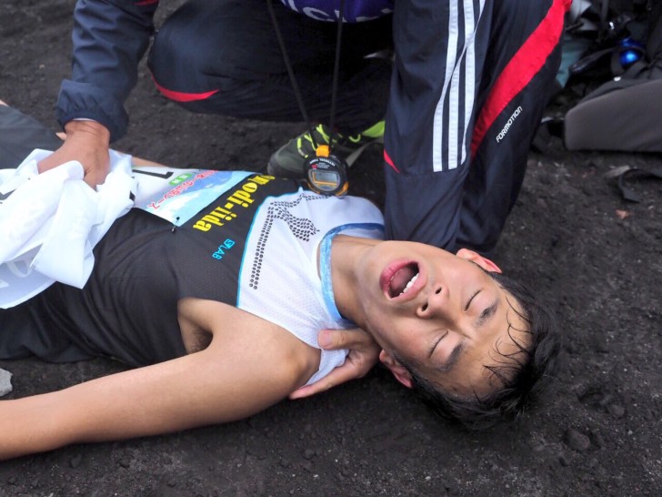 Celebrating its 70th running this year, the Fuji Mountain Race took place on Friday, July 28. As in past years, the first 10.8 km from Fujiyoshida City Hall at 770 m elevation to Umagaeshi at 1450 m was a gentle climb on paved roads. From Umageshi runners enter trails, and for the kilometer from Hanagoya at the 7th Station all the way to the 8th Station it becomes a very difficult 40-degree incline climb. After that runners pass through an area of rough volcanic rocks as they approach Mt. Fuji’s summit. Peaking out with a net elevation difference of 3000 m, the 21 km Summit Course continues to gain a reputation as Japan’s premier mountain race. Last year bad weather forced the race to be stopped at Mt. Fuji’s 5th Station, meaning that this year’s race would be the first time in two years that runners would finish at the peak.
