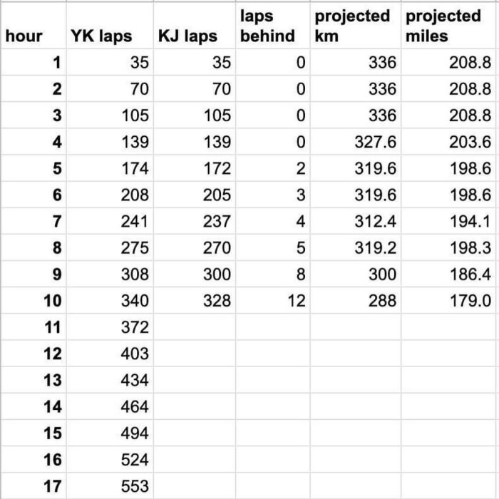Comparing from the 1st Hour to the 4th Hour, Yianni Korous and Kilian Jornet were the same in the number of laps that they have finished. But on the 5th Hour, Kilian was behind 2 laps and that started the downfall in Kilian Jornet’s attempt to break the Course Record of Yianni Kouras of running 303.5 kilometers in 24 hours. And at the 5th hour, KJ was overlapped for so many times by another runner, Sebastian Conrad Hakannson, who was a consistent winner of the Oslo Marathon Triple Race (Marathon, Half-Marathon, and 10K Race in the same day).